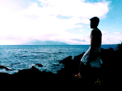 A tranquil beach scene with a model standing in the foreground. The individual is looking towards the ocean, where waves are visible and there's an island on the horizon. The sky above is partly cloudy, suggesting either early morning or late afternoon light conditions. This image may appeal to those interested in nature, outdoor photography, and travel.