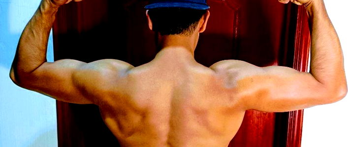 In this image, a well-built man in his early 30s is depicted in an indoor setting. He stands against a wall, his chiseled physique on full display. His bare chest, taut stomach and defined muscles hint at a rigorous fitness regime. The light reflects off his abdomen, creating a series of shadows that highlight his sculpted body. His face is partially obscured, the focus of the image being his body. He is wearing a pair of briefs or possibly swimwear, which contributes to the overall impression of strength and fitness. His thighs and limbs are also toned and muscular, further emphasizing his athletic build. His elbow is slightly bent, possibly suggesting a relaxed posture despite the intense physical display. The image exudes a sense of masculinity and physical prowess. It could be used in contexts related to fitness, bodybuilding, or sportswear advertising. The man's confidence in his physique is evident, making the image a powerful representation of physical fitness and body positivity.