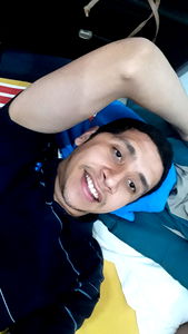 In this image, we see a young man lying on his bed with a broad smile on his face. He seems to be in a casual and comfortable setting, suggesting that the photo might have been taken during a relaxed moment at home. The man is casually dressed, indicating that he is probably not attending a formal event or engaging in work-related activities.