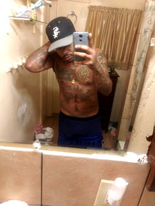 Tiger Hall, an OnlyFans model from Los Angeles Ca., is seen confidently posing for the camera in a bathroom. He has a tattoo on his arm and is wearing gold jewelry around his neck. His muscular build is accentuated by his stance.