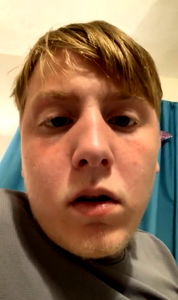 The image shows a man in the midst of an action shot, displaying an intrigued look. He has blond hair and is wearing a blue t-shirt. The background suggests he is indoors, possibly in a living room or bedroom.