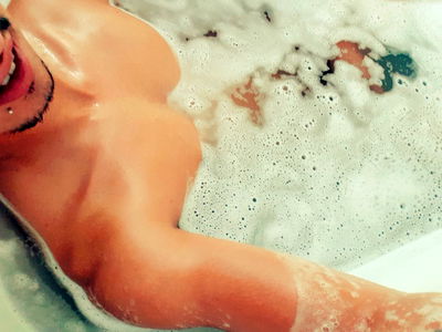 In this stunning photo from FRANCE, Onlyfans model Remy is captured in an age-defying moment of relaxation. He's lounging in a white tub filled with water and bubbles, his arms casually resting on the side of the tub. His chiseled physique and youthful appearance are on full display as he enjoys a soak. The stark contrast between Remy and the black background adds a dramatic touch to this visually captivating image.