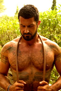 RocVent, a popular OnlyFans model, is seen lounging on the edge of a swimming pool. In this image, RocVent is captured mid-pose for a photo shoot. He's dressed casually, with his tattoos and muscular physique prominently displayed.