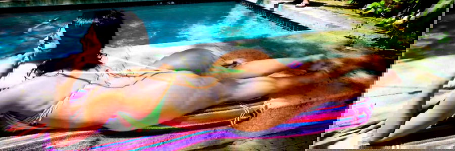 Rose Monroe, a popular OnlyFans model, lounging on a sunbed by the pool. She is enjoying a swim in the background.