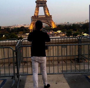 An evening visit to the iconic landmark, the Eiffel Tower. A photographer stands behind a railing, capturing this timeless symbol of French culture.