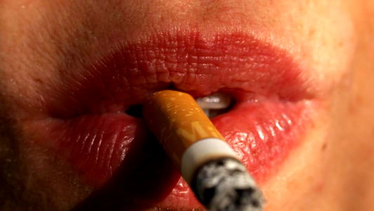 A woman with long blonde hair is seen smoking a cigarette. She appears to be in her 30s or early 40s, and has a neutral expression on her face.