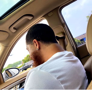 The image captures a moment of joy and excitement in the car, as seen from the back seat. The person in focus appears to be enjoying the ride and is possibly listening to music or having a conversation. They are wearing a white t-shirt and have short hair. The car interior suggests it might be an older model, with visible wear on the upholstery. The mood of the image is uplifting and carefree.