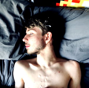 A young, tattooed man with dark hair and a beard. He is shirtless and lying down on a bed in a candid moment, gazing off to the side. The room has a modern aesthetic with minimalistic decor.