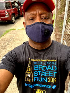 A man taking a selfie, wearing a face mask and holding a phone. He is standing on a sidewalk next to a building, with the event's signage in the background. A car is parked nearby.