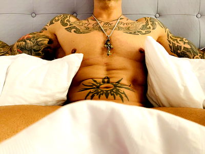 This image captures a moment of a jovial, bearded man in his prime, estimated to be around 32 years old. He's indoors, his friendly smile lighting up the space as he poses for the camera. The room is dominated by neutral shades, visible on the wall behind him and the bed that occupies part of the frame. His beard is a prominent feature, well-groomed and adding to his overall masculine appearance. The man's bare chest reveals well-defined muscles, a testament to his fitness and strength. It also acts as a canvas for a collection of tattoos, each one a personal symbol or story etched into his skin. These intricate designs add an edge to his otherwise warm and approachable demeanor. He's wearing some clothing, although the details are not in full view. The man's lively facial expression, combined with the intimate indoor setting, creates a relaxed and inviting atmosphere. The image is a snapshot of his life, portraying him as someone who's comfortable in his own skin and not afraid to express his individuality.
