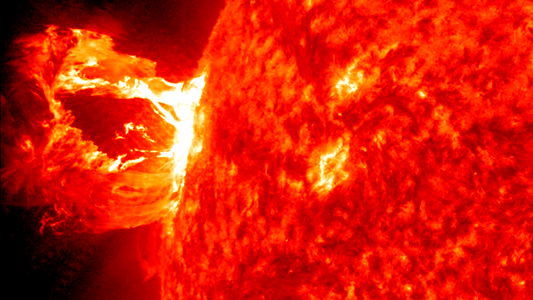 A vivid depiction of a solar flare captured in real-time, showcasing the powerful energy and activity at the sun's surface.