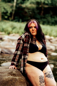 A photograph capturing Sage Marie, an OnlyFans model, in a lingerie pose near a river. She is seated on a rock with her hand resting on her knee, wearing a black bra and panties. Her tattooed arm and fingers are visible as she poses for the camera. The setting is serene, with trees and greenery surrounding the area.