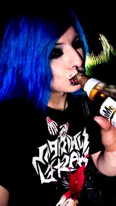 Sam Garcia, a young and vibrant Onlyfans model with striking blue hair. In this image, she's enjoying a beverage while holding her phone, possibly recording her experience. Her energy is palpable even in a still photo. The background is blurred, keeping the focus on Sam.