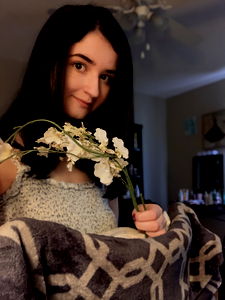 Sam, as an OnlyFans model, captures a moment of tranquility in this image where she enjoys a casual selfie with a beautiful bouquet of fresh flowers. Her attire suggests a spring or summertime theme to the photo, and her warm smile indicates a sense of contentment.