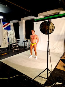 This image presents a striking depiction of a man in his prime, estimated to be around 28 years old. He is in an indoor setting, adding an intimate touch to the photograph. The man's physique is the focus of the image, highlighting his well-defined musculature, indicative of bodybuilding. His chest and abdominal muscles are particularly prominent, hinting at the significant time and effort he must have invested in his body. The man is bare-chested, revealing not just his musculature, but also details like his navel. His lower body is covered by briefs, an undergarment that further emphasizes his muscular thighs and abdomen. The man's face, while not the main focus of the image, is also visible, adding a personal touch to the otherwise fitness-oriented image. The man's attire, or lack thereof, could suggest that he is a swimmer or bodybuilder, as his briefs resemble a swim brief. His muscular physique and the indoor setting give the image a strong association with bodybuilding, or perhaps a modeling shoot for athletic or underwear fashion. Overall, the image exudes strength, discipline, and a dedication to physical fitness.