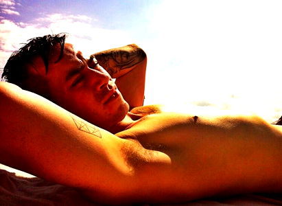 Buga, a popular OnlyFans model from Phuket, is seen enjoying a sunbath with his toned physique. He's laying down, soaking up the rays, and sporting a tattoo on his left arm. His hair is slicked back, adding to the laid-back vibe.