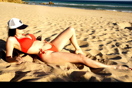 Scarlett O'hara is a stunning Onlyfans model posing on the beach. She wears a vibrant bikini and stands confidently in front of the ocean. Her image captures her youthful energy and beachside beauty.