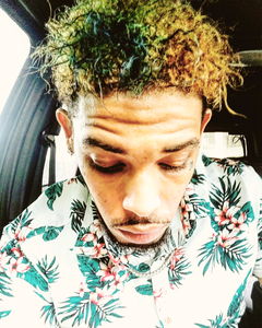 In the image, a male model with dyed hair is seen outside a car. He's wearing a camouflage shirt and sunglasses, giving off a casual yet stylish vibe. His gaze is directed towards something outside of the frame, perhaps indicating curiosity or contemplation.