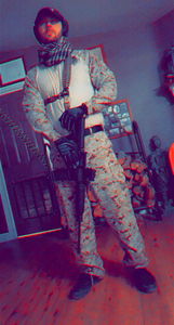 In the image, a person dressed as a military personnel is standing indoors. They are wearing a full uniform and holding what appears to be a rifle. The individual has short hair and is looking directly at the camera with a neutral expression.