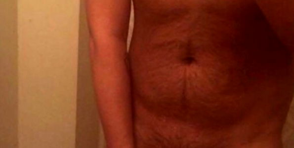 Full-body image of a person showcasing chest hair on OnlyFans. The individual is laying down with their head resting on one hand and the other hand placed on their chest, highlighting the hairy area. The background suggests a cozy setting.