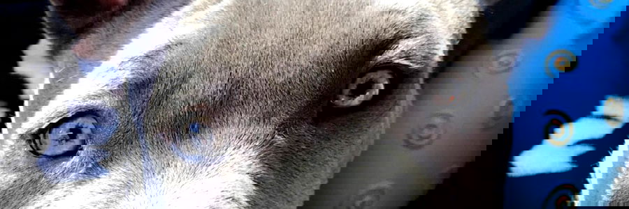 A model with blue eyes and a blue background looking at the camera.