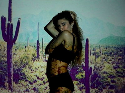 An Onlyfans model in a desert-inspired photoshoot with cacti. Posing in an athletic black swimsuit, Caley captures attention with her confident gaze and relaxed posture.
