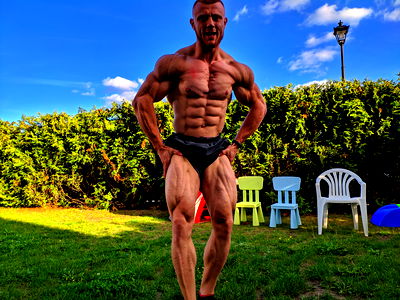 This is an image of Serious7/ Master Madjack, a bodybuilder showcasing his muscular physique in an outdoor setting. He is striking a pose for the camera, flexing his muscles to highlight his dedication to fitness. The background suggests he might be preparing for or recovering from a workout session.