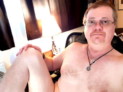 A man with glasses and a beard posing shirtless. He has a tattoo on his right arm, and is sitting with one leg crossed over the other. The room appears to be a bedroom or study.