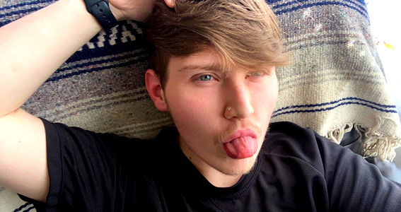 In this image, Los Angeles model Shawn is seen striking a playful pose with his tongue sticking out. He's captured in his casual attire of a black t-shirt and blue jeans, exuding a relaxed vibe.