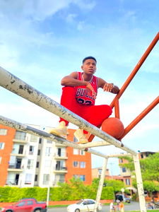 Sh, a young adult male, is standing on a street at night. He's wearing a red bucket hat, a white t-shirt with a graphic design on it, orange shorts, and black and white sneakers. In his hand, he holds a cigarette, perhaps taking a break from his night out. He's in front of a building which has a balcony visible. The sky is dark, suggesting that the photo was taken in the evening.