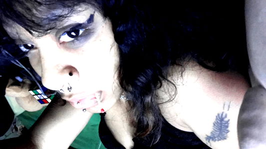 A person is seen in the image. They are posing for a photo and looking directly at the camera. The individual has tattoos visible on their arm and a distinct hairstyle with spikes. They are wearing a dark top or dress and have visible piercings, including what appears to be a septum piercing. They are also sporting an earring. The person is indoors as suggested by the indoor lighting and the interior of a car is partially visible in the background.