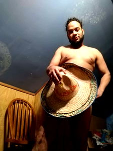 A man with a beard and tattoo, captured in a candid moment. He sports a casual hairstyle and is seen from the chest up against a simple backdrop.