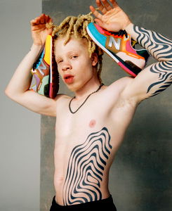 In this image, the renowned Onlyfans model Mushrooom is striking a pose with his feet playfully up against his body. He's wearing vibrant sneakers that stand out against his unique tattooed body. A native of New York, USA, he's showcasing his eclectic style and giving us a glimpse into his life as an influencer.