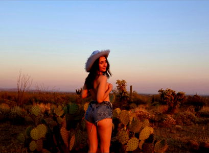Skylar Shorts, an OnlyFans model, poses topless for a stunning desert photoshoot. She's holding a blue cowboy hat and wearing jean shorts, embracing the wild Arizona landscape. This image is sure to capture attention with its striking composition.