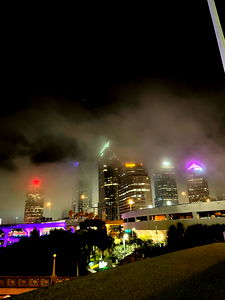 Experience a foggy evening in the cityscape of Tampa, Florida. The sky is shrouded in clouds as the city lights twinkle against the dense fog, creating a serene and atmospheric scene. This image captures the essence of Tampa's nightlife amidst a touch of nature's grandeur.