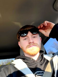 A man with short hair and glasses is seen inside a car. He is wearing sunglasses and appears to be casually dressed. Shawn F is sitting on the back seat, looking directly at the camera.