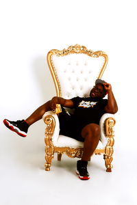 In this epic shot, Smiley from Atlanta is captured on a luxurious golden chair, exuding confidence and style. He's dressed casually in a black t-shirt, yet he commands attention with his arms crossed over his chest. The background is minimalist, keeping the focus on Smiley and his throne. His face is lit up with a smile that lights up the room, reflecting his infectious energy and positive vibes.