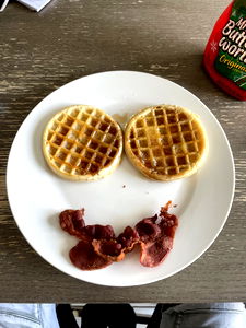 A fun and appetizing breakfast plate featuring two waffles topped with bacon, set on a dining table. The arrangement is playful, with the bacon appearing to be a face of mischief.