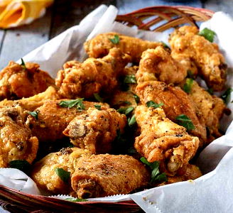 A tantalizing plate of crispy chicken wings, seasoned and baked to perfection. The golden-brown color of the chicken suggests they're cooked to a mouth-watering finish. Garnished with green herbs for an extra burst of flavor. A delightful dish that is perfect for a hearty meal or as a snack. Serve these wings hot, with your favorite dipping sauce.