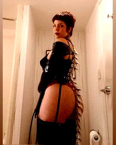 This is an image of OnlyFans model Sai Devas Leรณn in a bathroom, poised with confidence. She's dressed in latex and lingerie, giving off an edgy vibe. The background reveals a restroom setting.