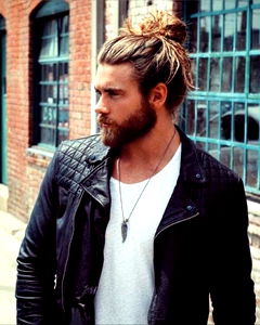 A confident man with long hair and beard, donning a black leather jacket and a necklace, set against an urban backdrop.