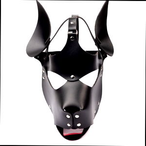 A striking image of a black leather dog mask, designed to resemble the head of a french bulldog. The mask features pointed ears and a stylized snout, evoking a sense of canine playfulness while also maintaining an edgy aesthetic. It's presented against a white background, allowing its intricate details to stand out.