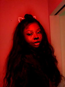 Strawberry Lennox, a social media influencer, poses for the camera with a playful cat ears accessory. Her long, flowing hair and vibrant outfit add to her energetic persona.