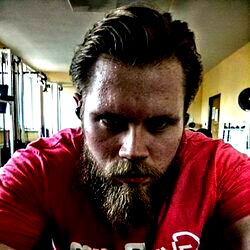 A bearded man with a strong jawline, wearing a red t-shirt and sporting a beard in the gym. He appears intense, perhaps after a workout session.