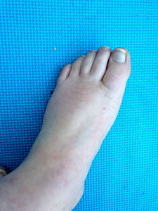 A detailed look at the foot, focusing on toenail health and grooming practices. The image displays a close-up of a barefoot with yellowed nails, a common sign of poor nail hygiene.