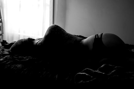 A professional and intimate portrait of OnlyFans model Maggie O'Malley, featuring her in a seductive pose with tattoo sleeves.