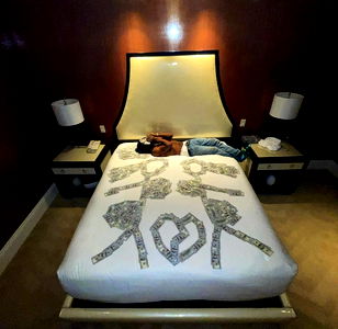 High-resolution image of a model in a luxurious bedroom setting. The room features elegant decor, including a large bed with intricate designs and a monogrammed headboard, and a nightstand with two white lamps on either side.