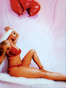 A striking image featuring the OnlyFans model Cleofromlondon posing with balloons and against a pink background. She is dressed in red lingerie, which matches the romantic theme of the shoot.