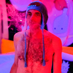 The image features an adult male model posing in a room with a low light setting. He is wearing a unique blue beanie and glasses, which gives him a distinctive look. The background is blurred but appears to be indoors with some colorful elements.