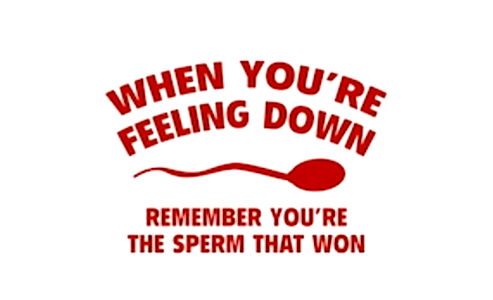 Humorous statement for a brand or product, encouraging perseverance with a playful reference to sperm. Not suitable for all audiences due to adult themes. Recommended for mature and comedic content.